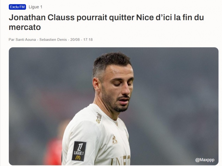8月20日,根据记者Santi Aouna透露的消息,尼斯后卫乔纳森-克劳斯或将在今夏转会窗口关闭前告别球队。